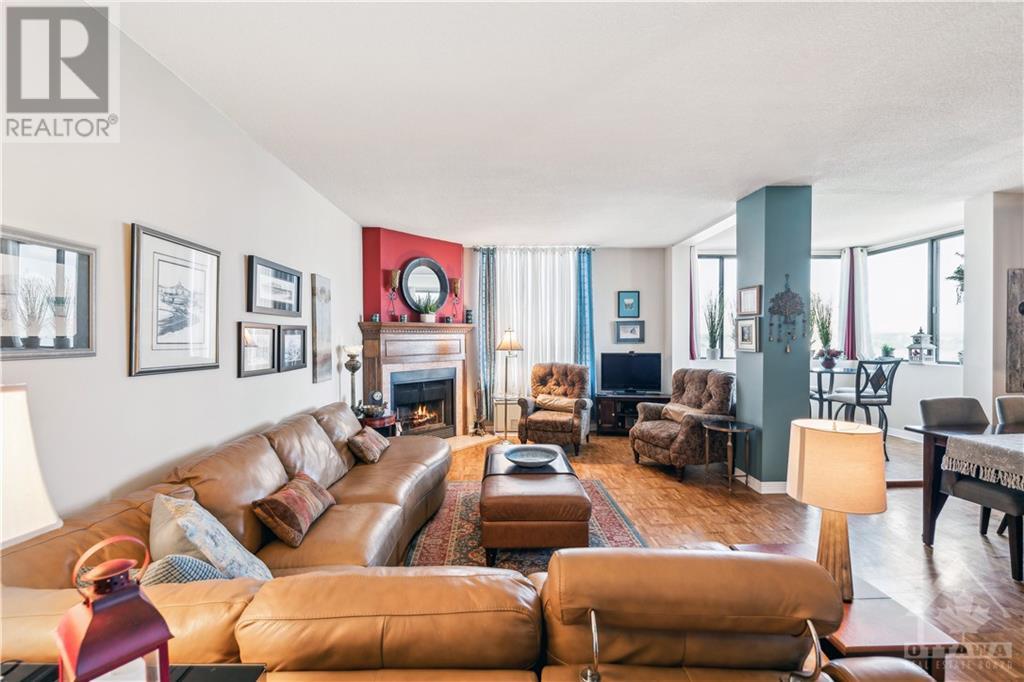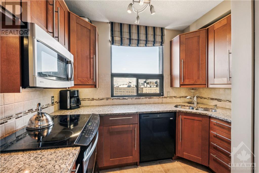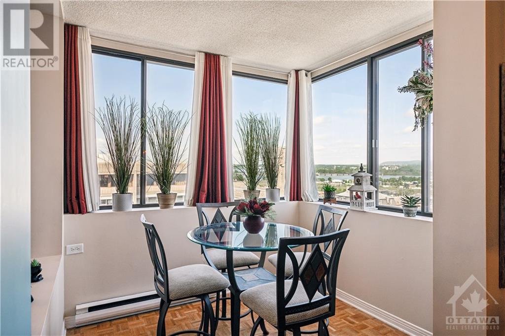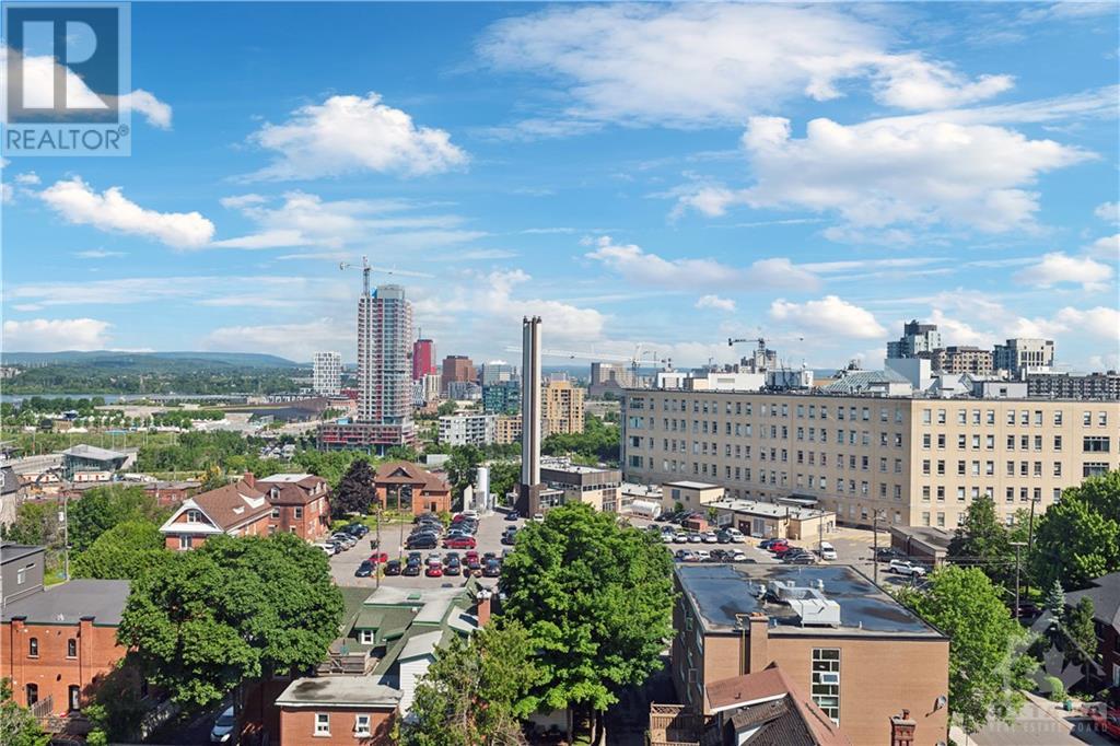 Welcome to 1101-40 Arthur Street! This condo boasts over 1000 square feet of living space with large principal rooms. The living room / dining room with wood burning fireplace is adjacent an open solarium with extraordinary views of the Ottawa River and Gatineau Hills. The updated kitchen features stainless steel appliances, ample cupboards, a granite countertop, and a large window. A convenient powder room is nearby. A corridor offers privacy to the two generous bedrooms. The smaller bedroom is so large it is often used as the principal bedroom, leaving the larger one to serve as an office, den, or family room. Ample closets. This penthouse level suite has higher ceilings. Enjoy amenities like a sauna, library, gym, workshop, and a delightful garden. Hardwood and tile throughout. Located on a quiet side street in West Centre Town in Chinatown, at the top of Nanny Goat Hill. Little Italy, Lebreton Flats, and downtown nearby. In-suite laundry. Underground parking. Ample visitors parking (id:16400)
